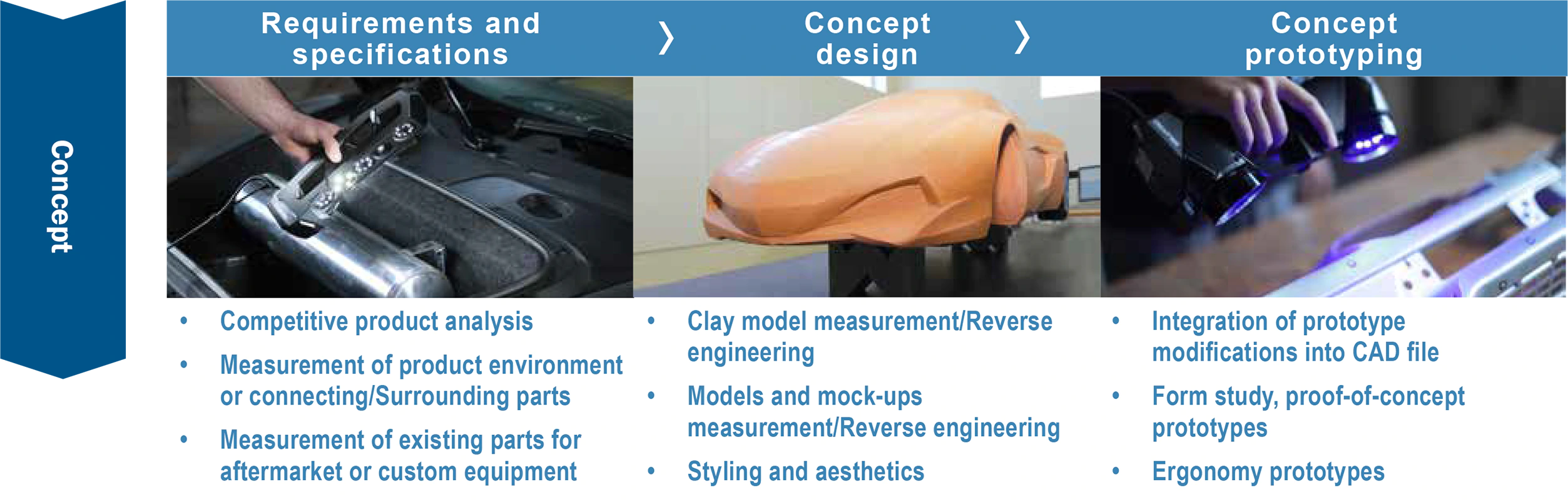 3D扫描在PLM的概念阶段被用于多种流程,包括需求和规格定义、概念设计(包括逆向工程)及概念原型制作。