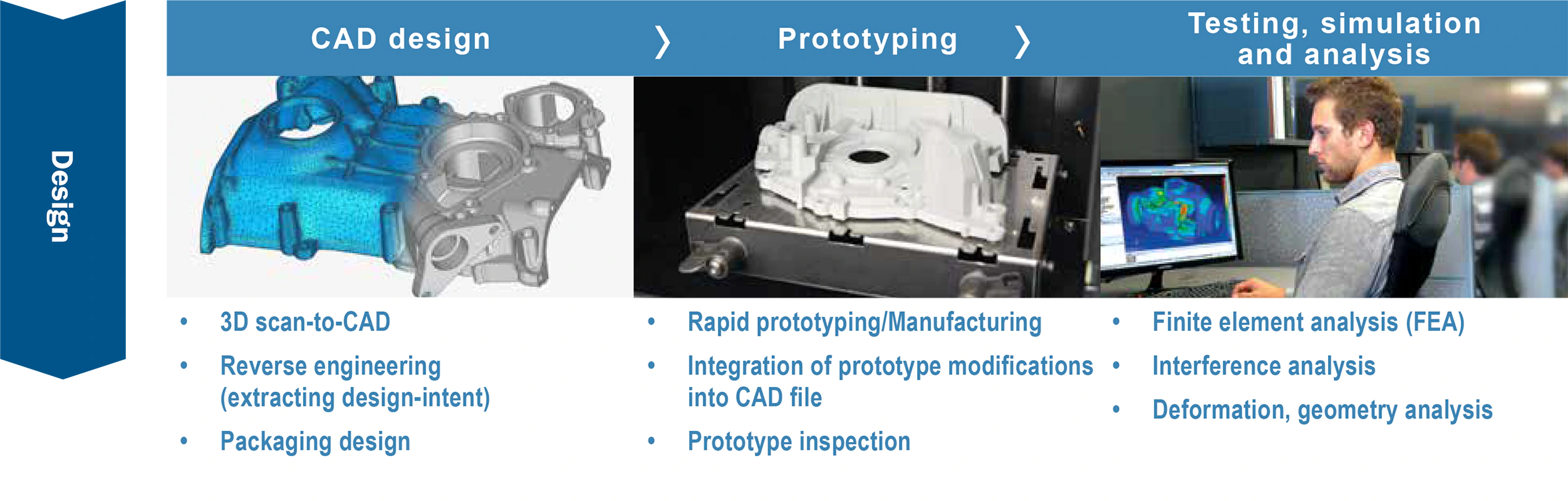3D扫描用于PLM的设计阶段,包括计算机辅助设计(CAD)、快速原型制作以及测试、仿真和分析(CFD,FEA)。