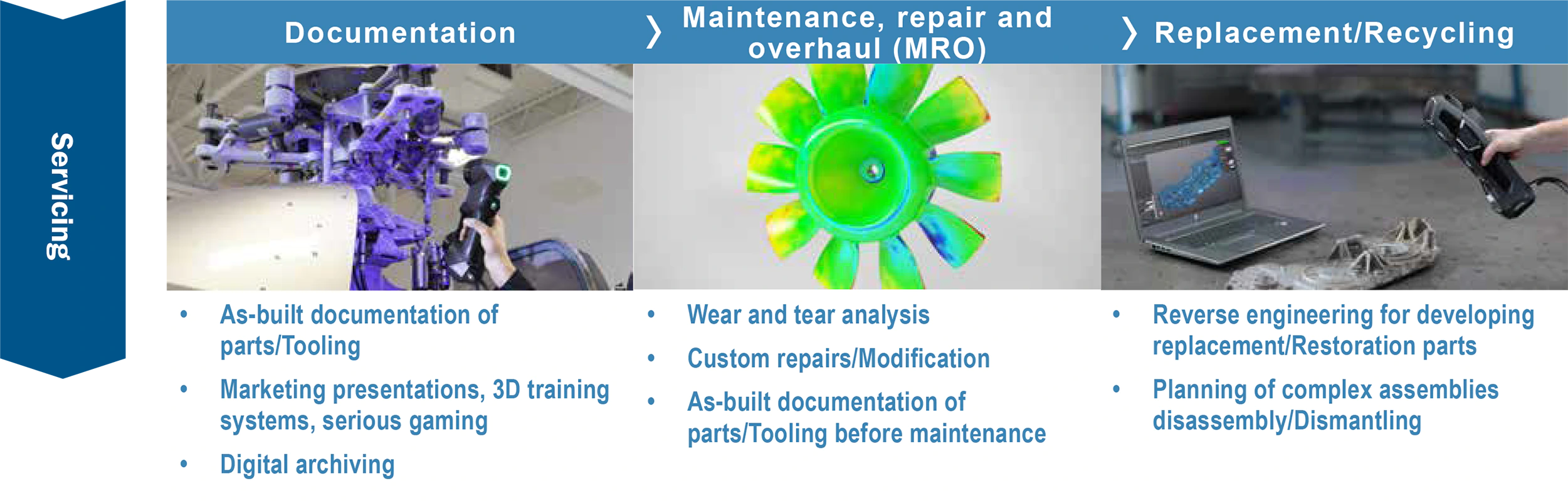 3D 扫描在 PLM 的服务阶段被应用于文档管理、维护、维修和大修(MRO)、以及部件的更换、回收和修复。
